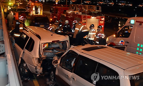 | △ 강변북로서 5중 추돌 교통사고 (서울=연합뉴스) 지난 26일 오후 서울 강변북로 성산대교 진입로 인근에서 5중 추돌 교통사고가 발생, 마포소방서 대원들이 부상자를 구조하고 있다. (마포소방서 제공) |