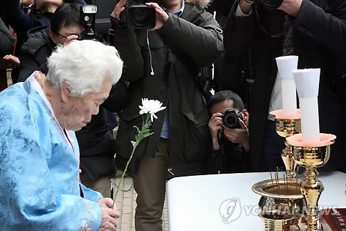 | △ 3·1절 앞두고 위안부 피해 할머니 추모제 (광주=연합뉴스) 경기도 광주시 퇴촌면 나눔의집에서 28일 '위안부 피해 추모제'가 열렸다. 추모제에서 위안부 피해 할머니들이 작년 8월 별세한 고 배춘희 할머니를 비롯한 피해자들의 넋을 기렸다. 2015.2.28 <<나눔의집 제공>> young86@yna.co.kr |