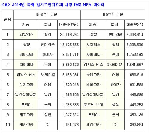 실데나필 성분의 발기부전치료제 수요가 분산되는 동안 타다라필 성분의 시알리스가 1위를 차지했고, 한미약품의 비아그라 제네릭인 '팔팔정'이 비아그라를 누르고 2위다. 팔팔정은 시알리스나 비아그라보다 가격이 저렴하기 때문에 매출량 기준으로는 압도적인 1위다.