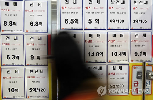 | △ 서울 시내 아파트의 평균 전세금이 도시 근로자 가구의 6년치 소득과 맞먹는 것으로 나타났다. 부동산114는 작년 12월 말 현재 전국 아파트의 전세 시세와 통계청의 지난해 도시근로자 가구(2인 이상 기준) 소득을 비교한 결과, 서울지역 평균 전세가격이 3억3천849만원으로 도시근로자 가구의 연간 소득(5천682만원)의 5.96배에 달했다고 밝혔다. 사진은 15일 서울 송파구 한 부동산 중개업소 모습. |