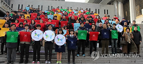 | △ 2015 우리의 소원-천만의 합창 '나비날다' 출범 (서울=연합뉴스) 왕길환 기자 = 오는 8월 15일 오후 8시 15분 한국과 전 세계에서 '우리의 소원' 노래를 함께 부르고 이를 SNS 등으로 생중계하는 음악 축제인 '2015 우리의 소원-천만의 합창 나비날다'의 출발을 알리는 행사가 1일 오후 서울 광화문 세종문화회관 앞 계단에서 추진위원 100여 명이 참가한 가운데 열리고 있다. '천만의 합창 국민위원회' 출범식에서 추진위원들이 빨간색, 황색, 녹색의 머플러를 펼쳐 손에 들고 기념촬영을 하고 있다. 2015.3.1 ghwang@yna.co.kr |