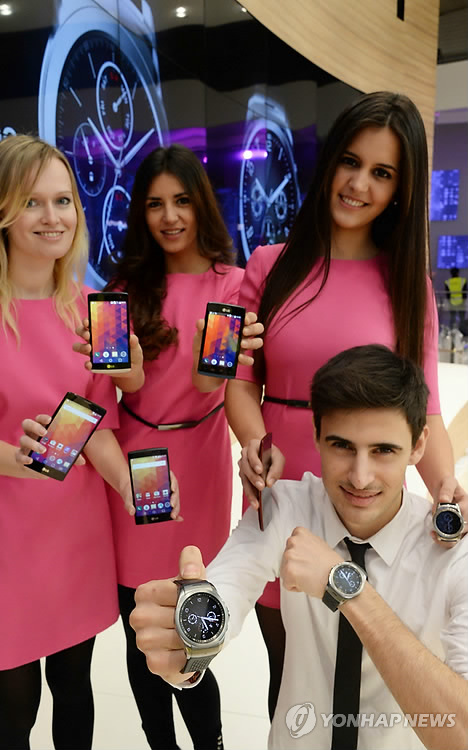| △ LG전자 모바일 월드콩그레스 혁신 제품 선보여 (서울=연합뉴스) LG전자가 스페인 바르셀로나에서 2일 개막하는 세계 최대 모바일 전시회 ‘MWC 2015(모바일 월드 콩그레스 2015)’에서 혁신 제품을 대거 선보인다.스페인 바르셀로나 피라 그란비아(Fira Gran Via) 전시장을 배경으로 모델들이 LG전자 핵심 전시제품들을 선보이고 있다. 2015.3.1 << LG전자 제공 >> photo@yna.co.kr |