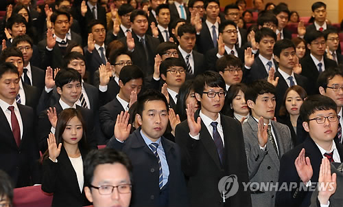 | △ 사법연수생 입소식 (고양=연합뉴스) 김도훈 기자 = 2일 오전 경기도 고양시 사법연수원 대강당에서 열린 46기 사법연수생 입소식에서 연수생들이 선서를 하고 있다. |