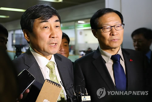 | △ '국정원 여직원 감금 사건' 첫 공판 (서울=연합뉴스) 박지호 기자 = 국가정보원 심리전단 소속 여직원을 감금한 혐의로 기소된 새정치민주연합 이종걸(왼쪽), 문병호 의원 등이 1심 재판을 위해 2일 오전 서초동 서울중앙지법 법정으로 향하다 취재진 질문에 답하고 있다. |