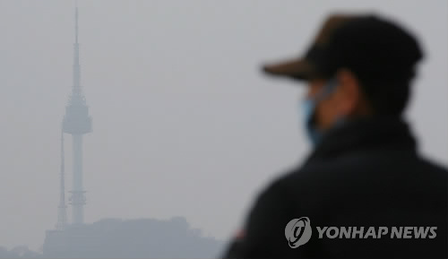 | △ 지난 달 22일 마스크를 쓴 시민 뒤로 안개에 가려진 서울 남산N서울타워의 모습이 보인다. |