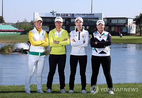 | △ 사진은 2014년 10월 14일 인천 영종도 스카이72 바다코스에서 열린 LPGA 하나·외환 챔피언십 공식포토콜에서 선수들이 기념촬영을 하는 모습. 왼쪽부터 이민지, 리디아 고, 김효주, 장하나. 2014.10.14 << LPGA 하나·외환 챔피언십대회본부 제공 >> photo@yna.co.kr |