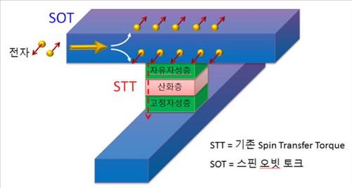 | △ 스핀 오비트 메모리 설명 그림. 기존 스핀 토크 엠램(STT-MRAM)은 수직방향으로 인가된 전류에 의해 동작하는 반면 스핀 오비트 메모리는 면내 방향으로 인가된 전류가 스핀 오비트 결합(spin orbit coupling)에 의해 수직방향으로 이동하는 스핀전류로 전환되며 이 스핀전류가 자유자성층의 자화방향을 바꾸는 방식으로 작동한다. |