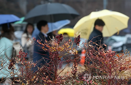| △ 서울에 내리는 비 (서울=연합뉴스) 한종찬 기자 = 비가 내린 3일 오전 서울 청계광장에서 시민들이 우산을 쓰고 남천나무 뒤를 지나고 있다. |