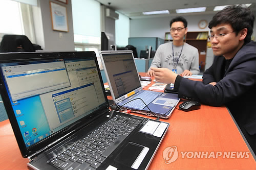 | △ (인천=연합뉴스) 하사헌 기자 = 인천지방찰청 사이버수사대 수사관들이 해킹 프로그램이 첨부된 메일을 열어본 컴퓨터(뒤쪽) 화면을 범행 컴퓨터(앞쪽)로 들여다보면서 공인인증서 비밀번호 등을 알아내는 해커들의 범행 수법에 대해 설명하고 있다. 2012.2.23 toadboy@yna.co.kr |