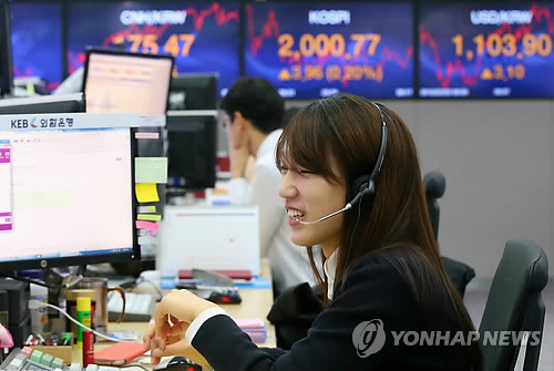 | △ 코스피, 2,000선 돌파 (서울=연합뉴스) 한종찬 기자 = 코스피가 3일 대외 불안 여건 완화와 유동성 장세에 대한 기대감으로 장중 2,000선을 돌파했다. 이날 코스피지수는 5.69포인트(0.28%) 오른 2,002.50로 개장해 2,000선 부근에서 움직임을 이어나가고 있다. 사진은 이날 오전 서울 중구 외환은행 본점 딜링룸. |
