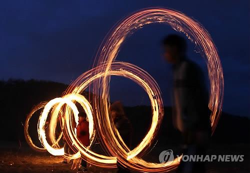| △ (대전=연합뉴스) 양영석 기자 = 정월 대보름을 일주일여 앞둔 지난달 25일 대전 대덕구 신탄진동 현도교 아래에서 열린 쥐불놀이 체험에 참가한 시민들이 불놀이를 하고 있다. 2015.2.25 |