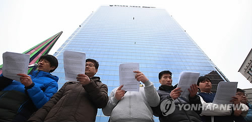 | △ 기자회견하는 연세재단빌딩 노동자들 (서울=연합뉴스) 김도훈 기자 = 공공운수노조 서경지부 조합원들이 3일 오전 서울 중구 연세재단세브란스빌딩 앞에서 연세재단과 한국자산관리협동조합 규탄하는 기자회견을 하고 있다. 이들은 재단 관리본부 측이 기존 시설관리소장이 설립한 협동조합을 통해 사실상의 구조조정을 진행하고 있다고 주장했다. 2015.3.3 superdoo82@yna.co.kr |