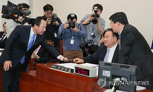 | △ '김영란법, 영유아법' 법사위서 난항 (서울=연합뉴스) 진성철 기자 = 홍일표 법사위 여당 간사(왼쪽 부터), 이상민 위원장, 전해철 야당 간사가 3일 국회 법제사법위원회 전체회의에서 '김영란법, 영유아보육법' 처리가 난항을 겪자 논의하고 있다. |