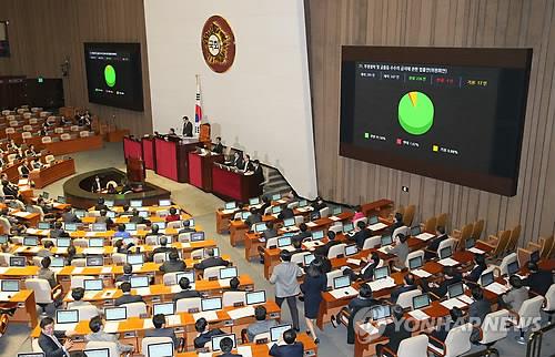 | △ '김영란법' 국회 본회의 통과 (서울=연합뉴스) 진성철 기자 = 3일 국회 본회의에서 '김영란법'으로 불리는 부정청탁·금품수수금지법 제정안이 통과되고 있다. 제정안은 재석 의원 247명 가운데 찬성 226명, 반대 4명, 기권 17명으로 가결됐다. |