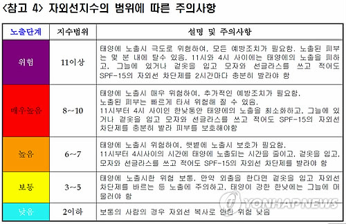 (서울=연합뉴스) 정빛나 기자 = 기상청은 4일부터 자외선 A와 B를 모두 반영한 '총자외선 지수' 정보를 홈페이지(www.kma.go.kr)를 통해 정식 제공한다.