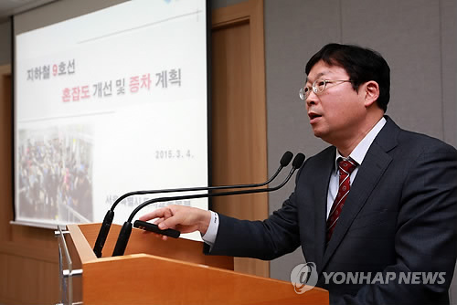 | △ 9호선 2단계 구간 개통 대비 혼잡완화대책 발표 (서울=연합뉴스) 박동주 기자 = 지하철 9호선 2단계 구간 신논현역∼종합운동장역이 28일 개통할 예정인 가운데 4일 오전 서울 시청 신청사에서 김경호 도시교통본부장이 개통 대비 혼잡완화대책 발표를 하고 있다. |