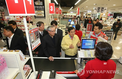 | △ 노동시장구조개선특위 임금체계 개편 사업장 방문 (서울=연합뉴스) 임헌정 기자 = 김대환 경제사회발전노사정위원회 위원장과 이병균 한국노총 사무총장 등 노동시장 구조개선 특별위원회 위원들이 4일 오후 서울 송파구 잠실동 롯데마트 월드타워점을 방문, 캐셔 직원과 이야기를 하고 있다. 이들은 이날 방문에서 특위 논의 의제와 관련해 근로자와 사업주가 체감하는 현장의 문제점과 개선방향에 대한 의견을 청취했다. 2015.3.4 kane@yna.co.kr |