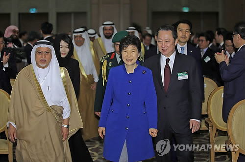 | △ 비즈니스 포럼 입장하는 박 대통령 (리야드=연합뉴스) 이정훈 기자 = 박근혜 대통령이 4일 오전(현지시간) 사우디아라비아 리야드 포시즌스호텔에서 열린 한국·사우디아라비아 비즈니스 포럼에 박용만 대한상공회의소 회장(오른쪽), 알 자밀 사우디 상의 회장(왼쪽)등 과 함께 입장하고 있다. |