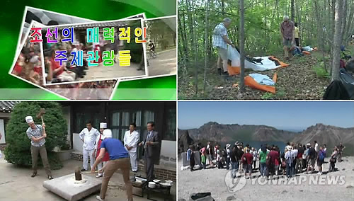 | △ 북한 외국인관광 "캠핑부터 농장체험까지" (서울=연합뉴스) 조선중앙통신은 지난달 26일 '조선의 매력적인 주제관광들'이라는 제목의 홍보영상을 제작해 홈페이지에 올렸다. 4분 길이 영상은 관광지와 관광객의 모습을 담은 영상과 관광상품을 소개하는 남성의 내레이션, 경쾌한 배경 음악으로 구성됐다. 외국인들이 캠핑과 체육, 농장체험 등 북한 관광을 즐기는 영상의 한 장면. |