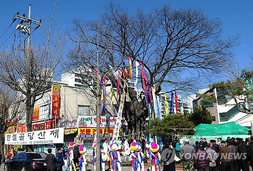 | △ 정월 대보름 앞두고 '당산제' 지내는 주민들 (대전=연합뉴스) 정월 대보름을 하루 앞둔 4일 대전 중구 보문오거리 인근에서 주민들이 '당산제'를 지내고 있다. (대전 중구청 제공) |
