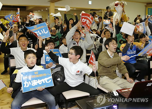 | △ 럭비월드컵 개최지선정에 기뻐하는 日재해지 주민들 (가마이시시<일본 이와테현> 교도=연합뉴스) 2011년 동일본대지진 피해지역인 이와테(岩手)현 남동부 해안의 가마이시(釜石)시 주민들이 지난 2일 2019년 일본 럭비 월드컵 개최도시 중 하나로 선정됐다는 발표에 기뻐하고 있다. 2015.3.5 jhcho@yna.co.kr |