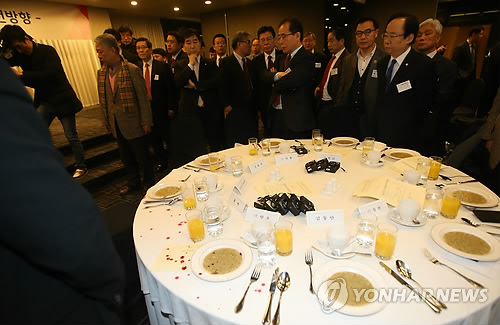 | △ 리퍼트 미 대사 습격당한 민화협 행사장 (서울=연합뉴스) 김주성 기자 = 마크 리퍼트 주한 미국대사가 괴한에 의해 습격을 당한 5일 오전 서울 세종문화회관에서 민화협 주최 초청 강연장의 리퍼트 대사가 앉았던 테이블의 핏자국이 선명하다. |
