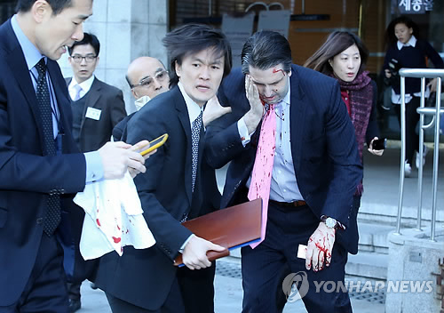 (서울=연합뉴스) 김효정 설승은 기자 = 마크 리퍼트 미국 대사가 세종문화회관에서 열린 행사에 참석 중 진보성향 문화단체의 대표로부터 공격을 받아 크게 다쳤다.