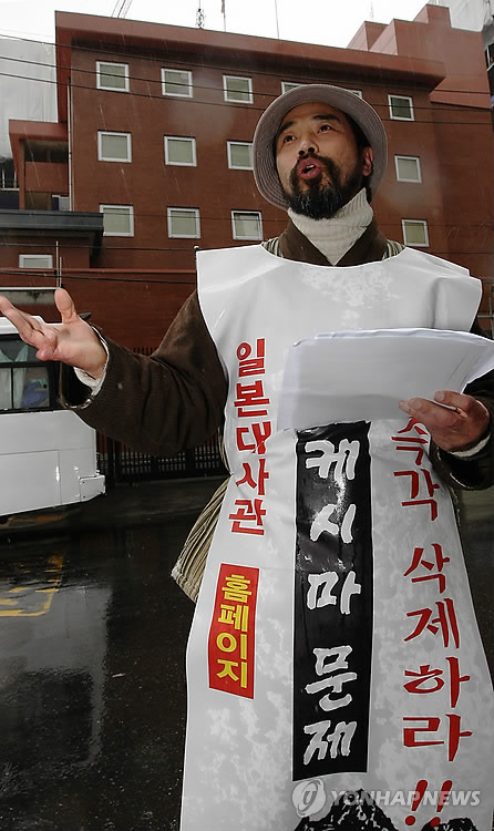 | △ 리퍼트 대사 습격 피의자 김기종 씨 (서울=연합뉴스) 마크 리퍼트 주한미국대사가 5일 오전 7시 40분께 세종문화회관 세종홀에서 열린 민족화해협력범국민협의회(민화협) 주최 조찬 강연회 장소에서 강의를 준비하는 도중 진보 성향 문화운동 단체인 우리마당 대표 김기종 씨로부터 흉기로 얼굴과 왼쪽 손목 부위를 공격당했다. 사진은 지난 2010년 2월 서울 중학동 일본대사관 앞에서 대사관 홈페이지 내 독도 관련 내용을 즉각 수정할 것을 주장하고 있는 김기종 씨. 2015.3.5 << 연합뉴스 DB >> photo@yna.co.kr |