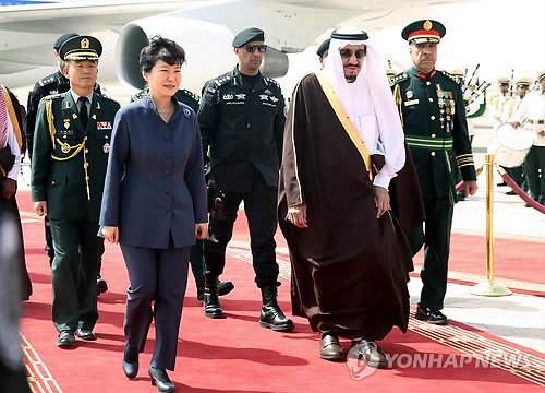 | △ 중동 4개국을 순방중인 박근혜 대통령이 지난 3일 오후 (현지시간) 두 번째 순방국인 사우디아라비아 리야드 킹칼리드 국제공항에 도착, 살만 빈 압둘아지즈 알 사우드 국왕의 영접을 받고 있다. |
