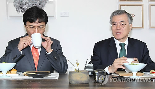 | △ 세종서 만난 문재인-안희정 (세종=연합뉴스) 이재림 기자 = 새정치민주연합 문재인 대표와 안희정 충남도지사가 5일 오전 세종특별자치시 금남면 한 갤러리에서 커피를 마시며 이야기를 나누고 있다. |