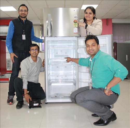 | △ LG전자가 가전업계 최초로 유엔으로부터 탄소배출권을 확보해 친환경 선도기업 이미지를 더욱 공고히 했다. 사진은 인도에서 청정개발체제 사업을 진행하고 있는 LG전자 직원들과 LG 냉장고. |