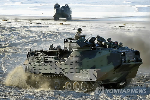 | △ (교도=연합뉴스.자료사진) 미국 해병대와 일본 육상자위대가 2월25일(현지시간) 미국 캘리포니아주에서 미군 수륙 양용차 'AAV7'을 활용한 대규모 낙도 탈환 훈련을 하는 모습. |