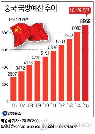 올해 중국은 중앙정부 차원의 예산으로만 국방분야에 전년보다 10.1% 늘어난 8천868억 9천800만 위안(약 155조원)을 배정했다.