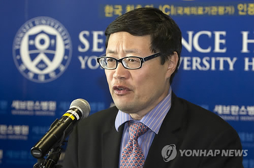 | △ 입장발표하는 미국대사관 공보참사관 (서울=연합뉴스) 윤동진 기자 = 5일 마크 리퍼트 주한 미국대사가 괴한에 피습당한 가운데 서울 서대문구 세브란스병원에서 로버트 W. 오번 미국대사관 공보참사관이 입장발표를 하고 있다. 2015.3.5 mon@yna.co.kr |