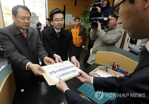 | △ 헌법소원심판청구서 접수하는 대한변호사 협회 (서울=연합뉴스) 최재구 기자 = 대한변호사협회 강신업 홍보이사(왼쪽)와 채명성 법제이사가 부정청탁 및 금품등 수수의 금지에관한 법률(김영란법)에 관한 헌법소원심판청구서를 5일 서울 헌법재판소 민원실에 제출하고 있다. 2015.3.5 jjaeck9@yna.co.kr |