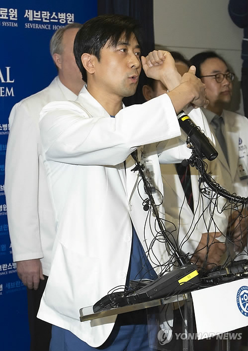 | △ 수술 상황 설명하는 주치의 (서울=연합뉴스) 윤동진 기자 = 5일 오후 서울 서대문구 세브란스병원에서 마크 리퍼트 주한 미국대사 수술 주치의인 최윤락 정형외과 교수가 수술 상황을 설명하고 있다. 리퍼트 미대사는 이날 오전 서울 세종문화회관에서 열린 민화협 주최 초청 강연에 참석했다가 괴한의 공격을 받았다. |