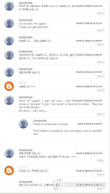 댓글을 단 시민들은 대부분 리퍼트 대사의 빠른 쾌유를 빌었고 '한국인으로서 죄송하다'며 안타까운 심정을 토로하는 댓글 등도 올랐다.