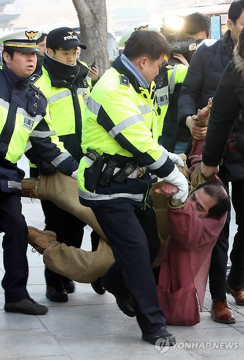 | △ 끌려가는 리퍼트 미 대사 습격 용의자 (서울=연합뉴스) 김주성 기자 = 5일 오전 서울 세종문화회관에서 열린 민화협 주최 초청 강연에서 마크 리퍼트 주한 미국대사를 습격한 김기종(우리마당 대표)씨가 경찰에 체포돼 끌려가고 있다. |