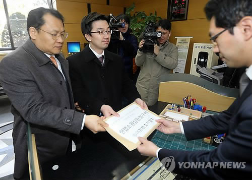 | △ 대한변협 김영란법 헌법소원심판청구서 접수 (서울=연합뉴스) 최재구 기자 = 대한변호사협회 강신업 홍보이사(왼쪽)와 채명성 법제이사가 부정청탁 및 금품등 수수의 금지에관한 법률(김영란법)에 관한 헌법소원심판청구서를 5일 서울 헌법재판소 민원실에 제출하고 있다. |