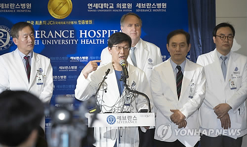 (서울=연합뉴스) 정빛나 기자 = 마크 리퍼트 주한 미국 대사의 수술을 집도한 신촌세브란스병원 측은 5일 오후 병원 교수회의실에서 정남식 연세의료원장과 윤도흠 세브란스병원장, 유대현 성형외과 교수, 최윤락 정형외과 교수가 참석한 가운데 수술 경과를 발표했다.