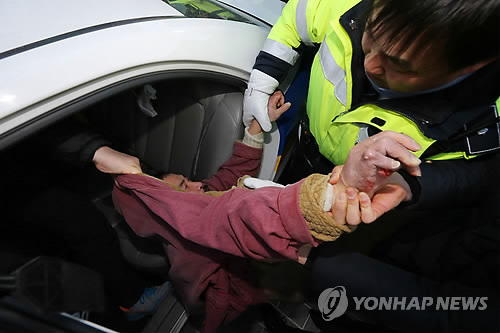 | △ 경찰차로 이송되는 리퍼트 미 대사 습격 괴한 (서울=연합뉴스) 김주성 기자 = 5일 오전 서울 세종문화회관에서 열린 민화협 주최 초청 강연에서 마크 리퍼트 주한 미국대사를 습격한 용의자가 경찰차로 이송되고 있다. |