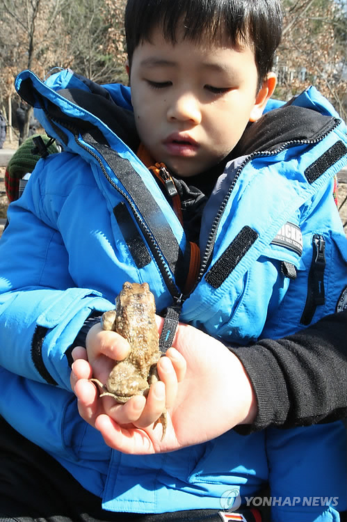 | △ '경칩'에 얼굴 내민 두꺼비…"산란하러 왔어요" (청주=연합뉴스) 황정현 기자 = '경칩'인 6일 한 어린이가 청주시 서원구 산남동의 한 아파트 단지 내 연못에 있던 두꺼비를 만져보고 있다. 2015.3.6. vodcast@yna.co.kr |