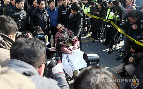 | △ 취재진 질문 받는 김기종씨 (서울=연합뉴스) 신준희 기자 = 지난 5일 마크 리퍼트 주한미국대사를 습격해 구속영장이 청구된 김기종 우리마당 독도지킴이 대표가 6일 오후 서울 종로경찰서에서 영장실질심사를 받기 위해 서초동 중앙지법으로 이송되던 중 취재진의 질문을 받고 있다. |