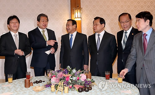 | △ 고위 당정청회의 시작 전 환담 (서울=연합뉴스) 신준희 기자 = 이완구 국무총리와 새누리당 김무성 대표, 청와대 이병기 비서실장 등이 6일 오전 서울 삼청동 총리공관에서 열린 첫 고위당정청 회의에 앞서 음료를 마시며 대화를 나누고 있다. |