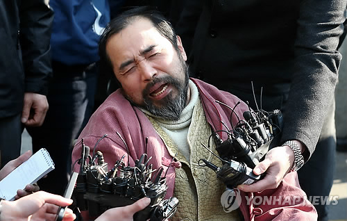 | △ 취재진 질문에 답하는 김기종씨 (서울=연합뉴스) 신준희 기자 = 지난 5일 마크 리퍼트 주한미국대사를 습격해 구속영장이 청구된 김기종 우리마당 독도지킴이 대표가 6일 오후 서울 종로경찰서에서 영장실질심사를 받기 위해 서초동 중앙지법으로 이송되고 있다. |