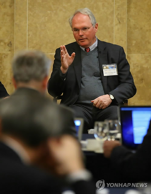 | △ 발언하는 힐 전 차관보 (서울=연합뉴스) 김도훈 기자 = 4일 오전 서울 소공동 롯데호텔에서 워싱턴타임스와 세계일보 공동주최로 열린 제21회 미디어콘퍼런스(세계언론인회의)에서 크리스토퍼 힐 전 6자회담 미국측 수석대표 겸 국무부 동아태담당차관보가 '21세기 동북아시아의 평화 전망 - 미디어의 역할'에 대한 자신의 생각을 말하고 있다. 2015.3.4 superdoo82@yna.co.kr |