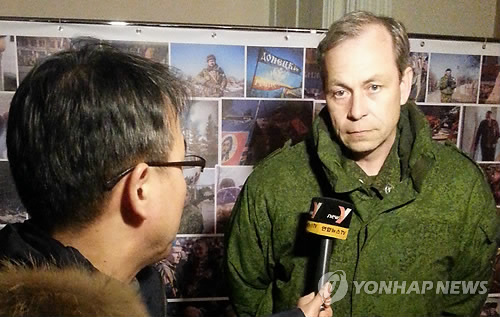 | △ (모스크바=연합뉴스) 유철종 특파원 = 도네츠크주 분리주의 세력이 자체 선포한 '도네츠크인민공화국' 국방부 대변인 에두아르트 바수린이 6일(현지시간) 도네츠크 시내 국방부 브리핑실에서 연합뉴스와 인터뷰하고 있다. 바수린은 "현재까진 대부분의 지역에서 휴전이 지켜지고 있지만 민스크 협정이 완전한 평화로 이어질 지는 아직 미지수"라고 말했다. 2015.3.7 cjyou@yna.co.kr |