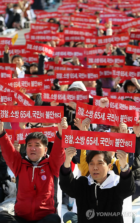 | △ (서울=연합뉴스) 한종찬 기자 = 7일 오후 서울역 광장에서 열린 '경찰·소방공무원 가족집회'에서 경찰청공무원노동조합 회원들이 구호를 외치고 있다. 이날 이들은 일선 지구대 근무자의 75% 가량이 40∼50대인 상황에서 정년 연장이 되면 현장 인력의 노쇠화가 심해져 국민에게 제대로 된 치안서비스를 제공할 수 없게 된다고 주장했다. 2015.3.7 saba@yna.co.kr |