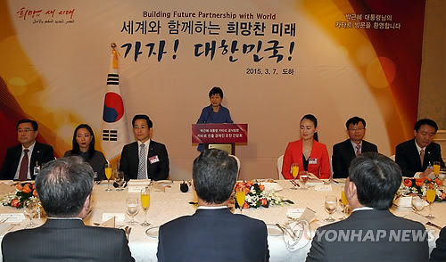 | △ 박 대통령, 카타르 진출 경제인 간담회 참석 (도하=연합뉴스) 도광환 기자= 박근혜 대통령이 7일 카타르 도하 시내의 한 호텔에서 열린 카타르 진출 경제인 오찬 간담회에 참석, 인사말을 하고 있다. |