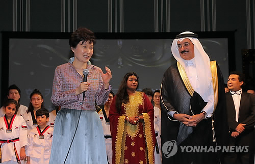(도하=연합뉴스) 정윤섭 박성민 기자 = 중동 4개국을 순방 중인 박근혜 대통령은 7일(현지시간) 마지막 방문국인 카타르에서 국기원 태권도 시범공연, '비상(飛上)'을 관람했다.